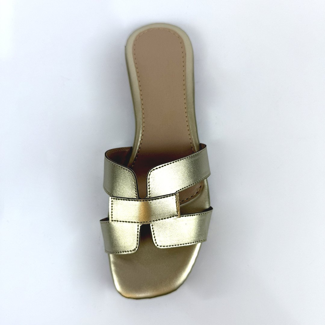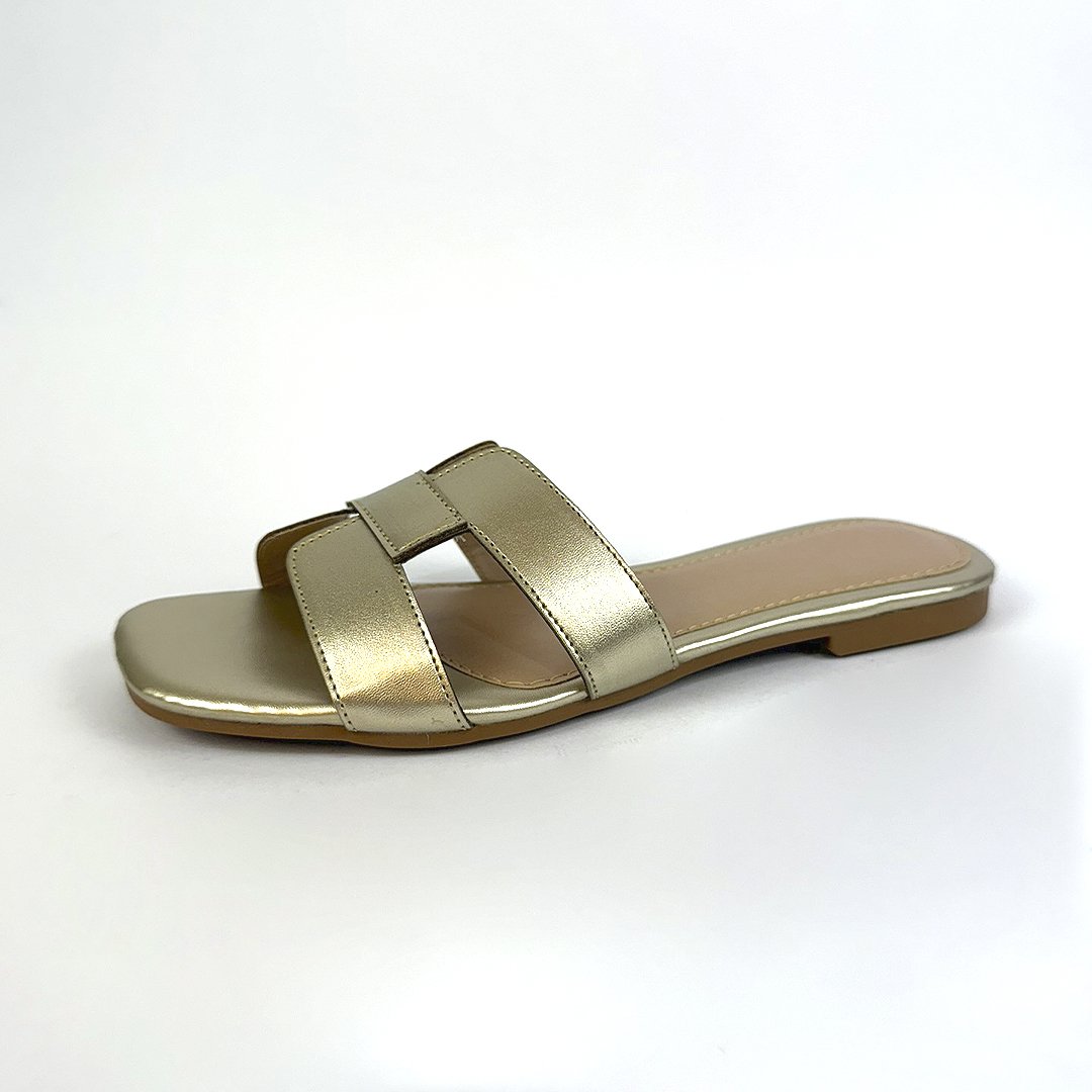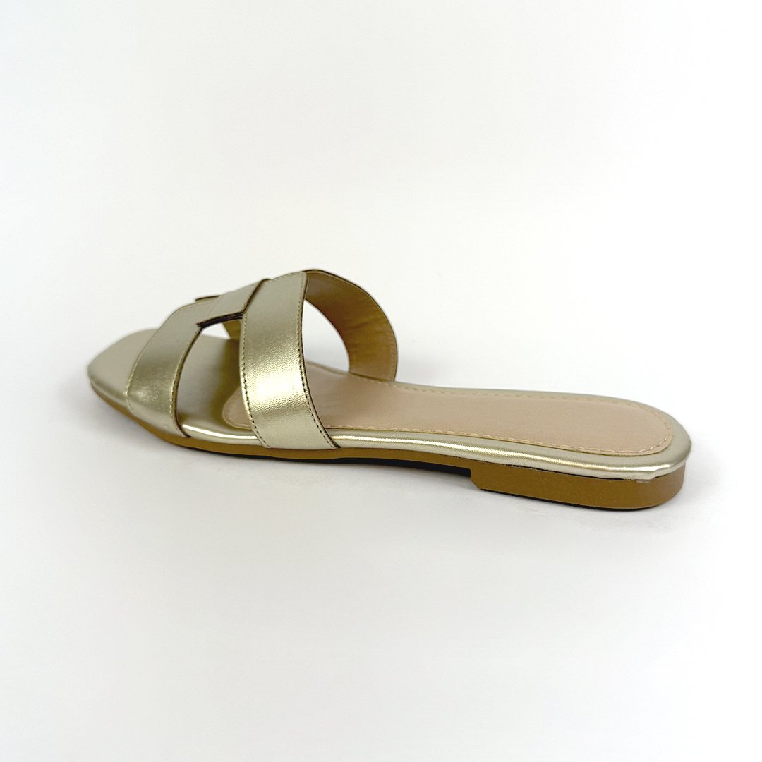 A Sandália Flat H da Lorena Cabral Shoes, na elegante cor Ouro, combina conforto e sofisticação, sendo perfeita para dias ensolarados com estilo.